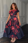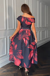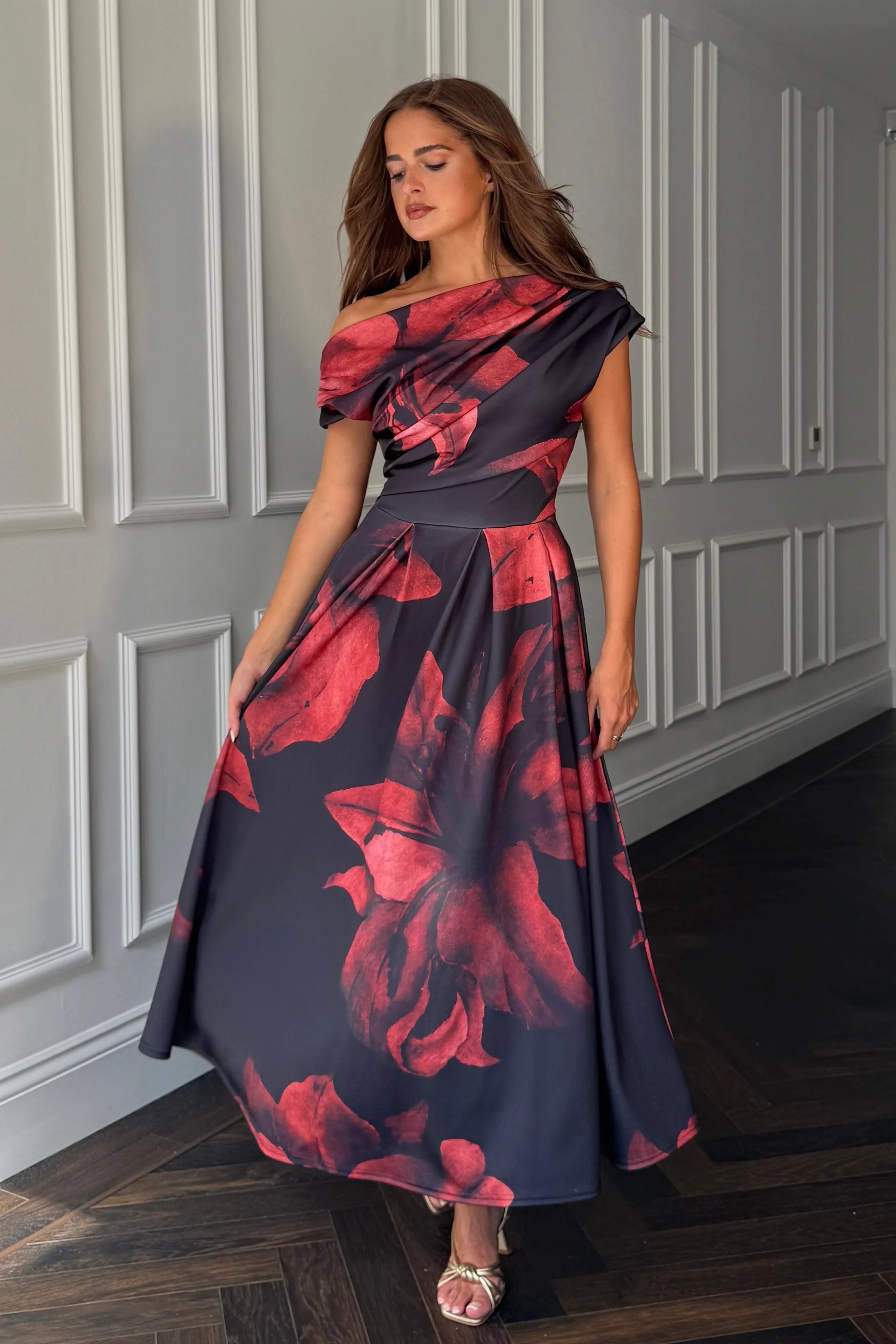 GIRL IN MIND Betty Asymmetric Neckline Skater Midi Black Floral