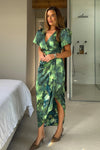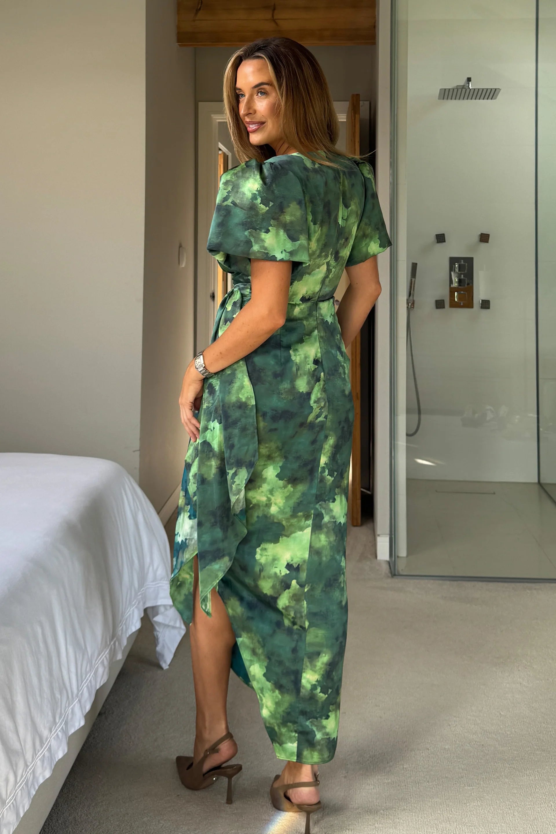 GIRL IN MIND Drew Puff Sleeve Wrap Front Midi Dress Green Marble