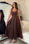 GIRL IN MIND Erica Square Neck Pleated Midi Dress Brown